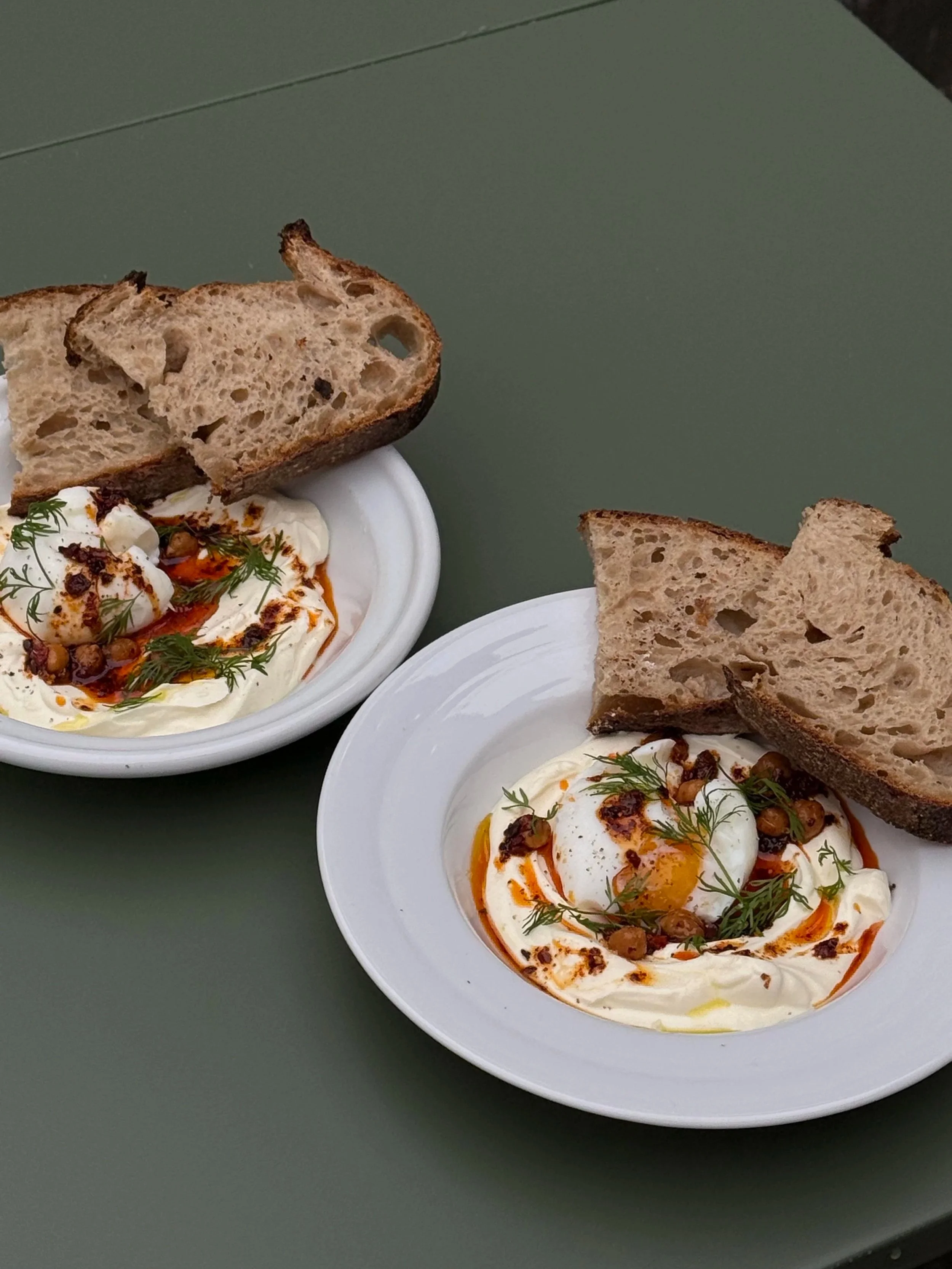 græsk yoghurt, smilende æg, chili olie med sprøde kikærter og dild, serveres med surdejsbrød – tilføj ekstra æg 19,-